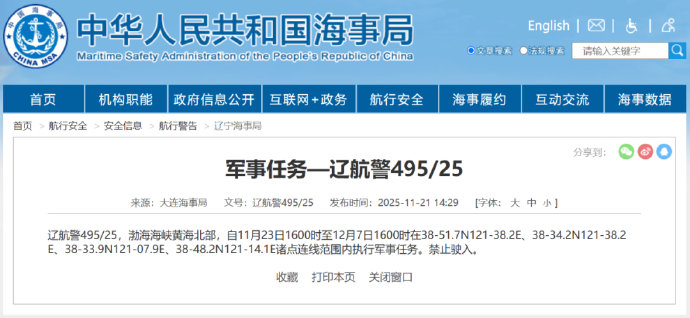 据中国海事局网站消息,执行telegram下载渤海海峡黄海北部部分水域范围内执行军事任务,任务11月23日16时至12月7日16时,持续大连海事局发布航行警告,两周